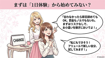 まずは「体験入店」で、お店の雰囲気を見に行くだけでもOKです。