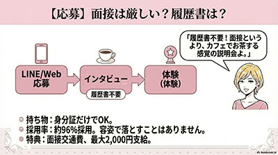 - 安心の金銭保証:「時給保証」と「全額日払い」で、初日から確実に稼げる。