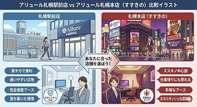 | 項目 | アリュール札幌駅前店 | すすきのエリアの店舗(アリュール札幌本店など) |