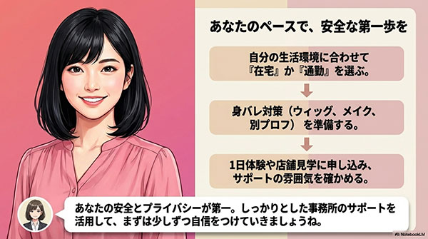 身バレの不安を取り除いて、心からリラックスしてお仕事をすることが、結果的に長く安全に稼げるコツになります。