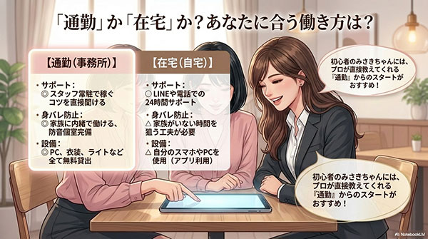 ご自身の生活スタイルに合わせて通勤か在宅かを選択すれば、未経験からでも安全に稼ぐことができます。