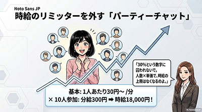 | パーティーチャット | 複数のお客さまと同時に会話 | 人数が増えるほど一気に時給換算が高くなる |
