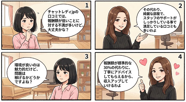 | チャットレディjp | 通勤約30%・在宅約50% | 未経験チャットレディの稼ぐノウハウ |