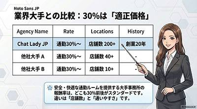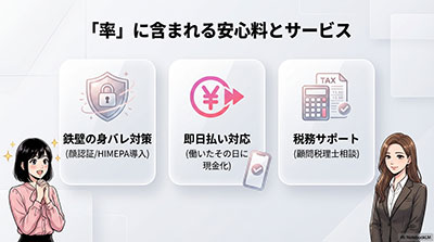 なぜなら、この報酬率の基準を守っている代理店は、スタッフのサポート体制や身バレ対策の仕組み作りにしっかりとお金をかけているからです。
