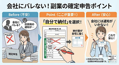 その際に住民税の納付方法を「普通徴収(自分で納付)」にチェックすれば、会社の給料から天引きされず、副業バレを防げます。