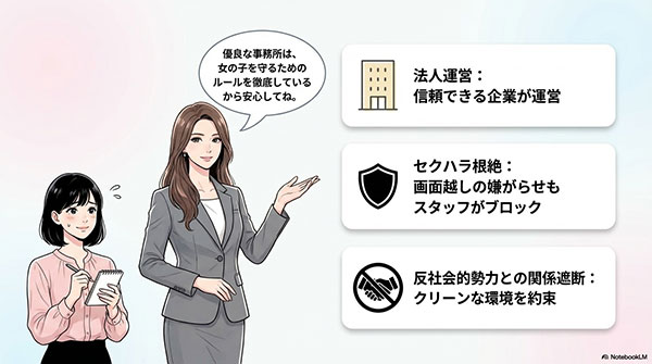 なぜなら、長年の運営実績がある事務所は、未経験の女の子が不安に思う「身バレ対策」や「稼ぎ方」のノウハウを完全にシステム化しているからです。