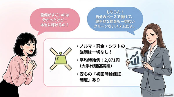 - シフトやノルマ、罰金が一切ないお店を選べば、自分のペースで無理なく長く続けられる