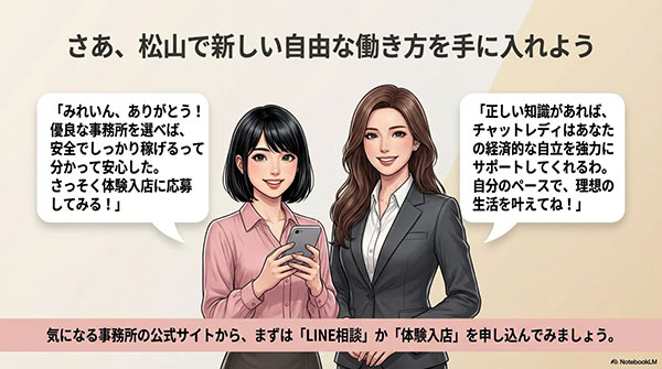「チャトレ 松山」で今日から安全に高収入を稼ぐなら、大手の優良事務所へ体験入店に申し込んでみるのが一番のおすすめです。