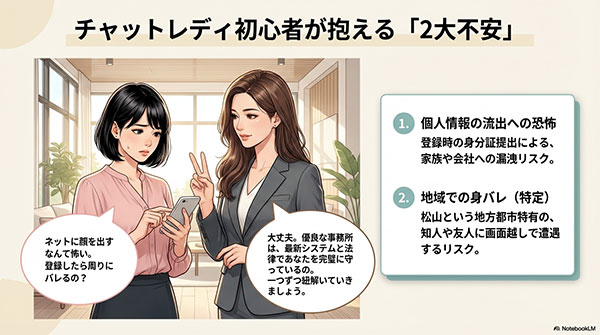 チャトレ 松山で身バレを防ぐなら、運営や面接を女性スタッフが担当してくれるお店を選ぶのが正解です。