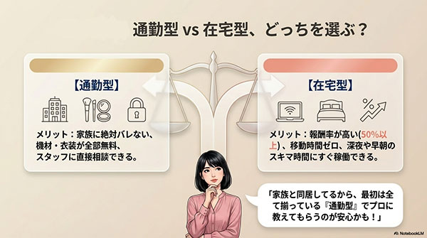実家暮らしで家族に絶対にライブ配信の音を聞かれたくない人や、今すぐ1万円以上の現金を日払いで手に入れたい人は、迷わず「通勤型」を選ぶのが正解です。