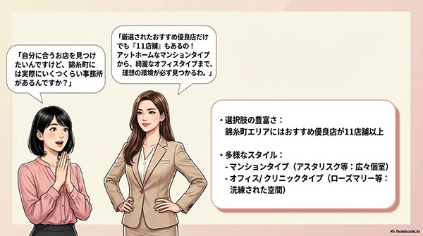 なぜなら、錦糸町は競合事務所が密集しているエリアであり、各社が「働きやすさ」や「安全性の高さ」で差別化を図っているためです。
