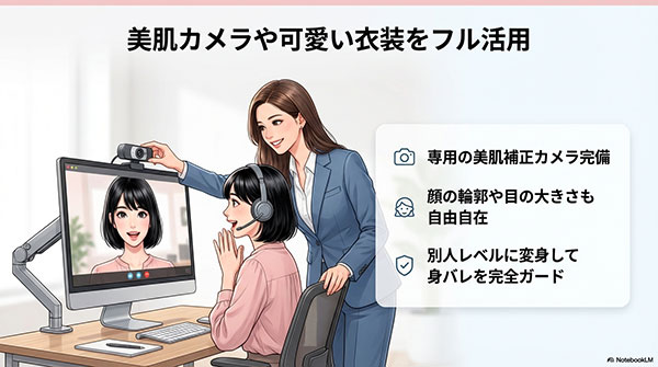 通勤型の最大のメリットは、美肌カメラや高性能な照明、100着を超える可愛い衣装などの高価な備品がすべて無料で利用できる点にあります。