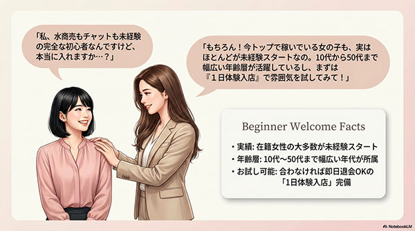 まずは体験入店(体入)から始めて、実際の職場の雰囲気やスタッフの対応を確認してみるのが、納得して働き始めるための賢い判断基準となります。