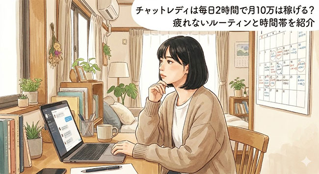 チャットレディは毎日2時間も働けば月収10万円は可能なので、その疲れないルーティーンと時間帯について紹介しています。