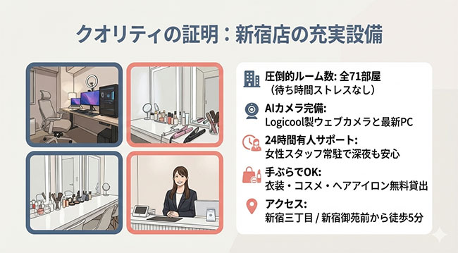 実際の口コミや報酬システム、新宿店のリアルな環境(71部屋の全貌など)まで、包み隠さず徹底解説します。