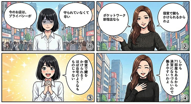 この記事では、ポケットワーク新宿店の「リアルな口コミ」や「稼げる仕組み」、そして新宿店ならではの「圧倒的な規模感(71部屋)」について解説してきました。