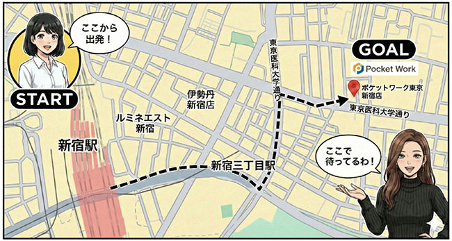 ポケットワーク新宿店があるのは、新宿区新宿5-6-13で、 最寄り駅は複数あり、どの路線を使ってもアクセス抜群です。