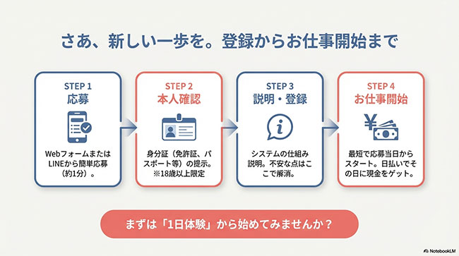 | ① WEB・LINE応募 | 公式サイトのフォームまたはLINEから応募。 名前・年齢・連絡先を入力するだけ(1分)。 | 24時間受付中! 電話が苦手な人はLINE応募がおすすめ。 |