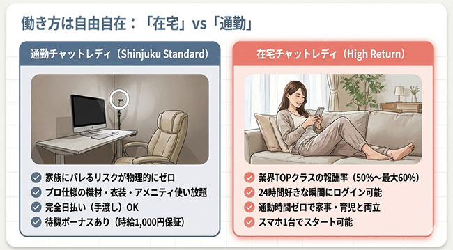 また、「最初は新宿店でノウハウを学び、慣れてきたら在宅に移行する」というハイブリッドな働き方も人気です。