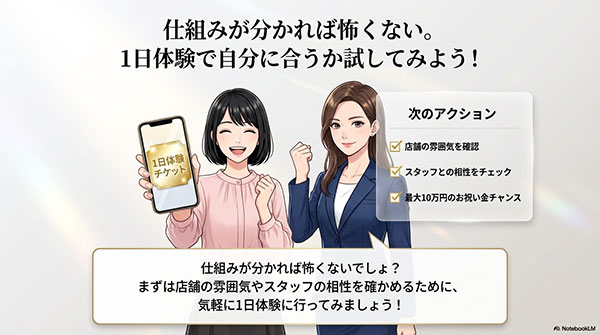 ただ稼がせるだけでなく、女性の不安に寄り添って二人三脚でアドバイスをしてくれるサポート体制は、未経験の方にとって非常に心強い味方になります。
