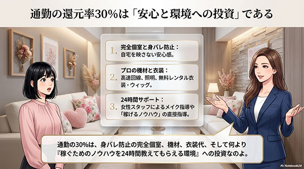 確かに数字だけ見ると低く感じるかもしれませんが、通勤には「綺麗で安全な個室」「高価なパソコン機材」「衣装や光熱費が無料」という大きな恩恵が含まれています。
