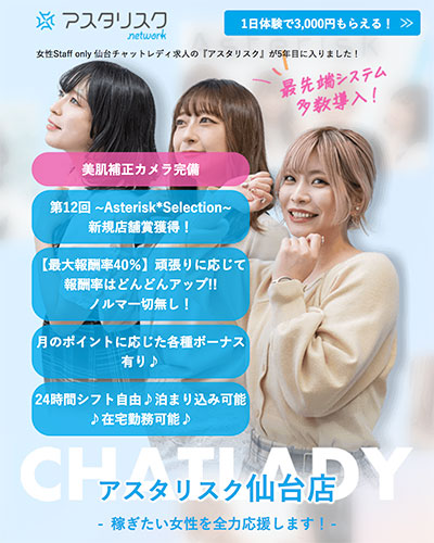 しかも、仙台・泉中央エリアには、主婦も稼ぎやすいアリアチャットや、何でも相談しやすいアスタリスクなどもあるのです。
