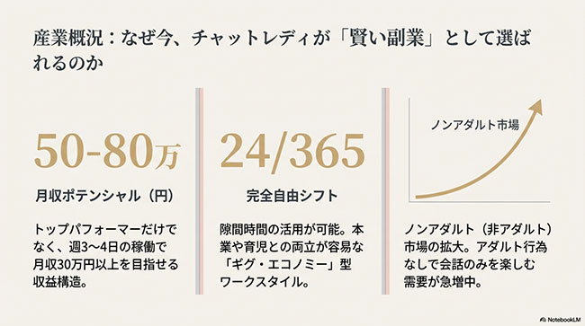 むしろ、競合(ライバル)となる若い学生が少ない分、30代以上の女性にとって「独占的に稼ぎやすい」環境です。
